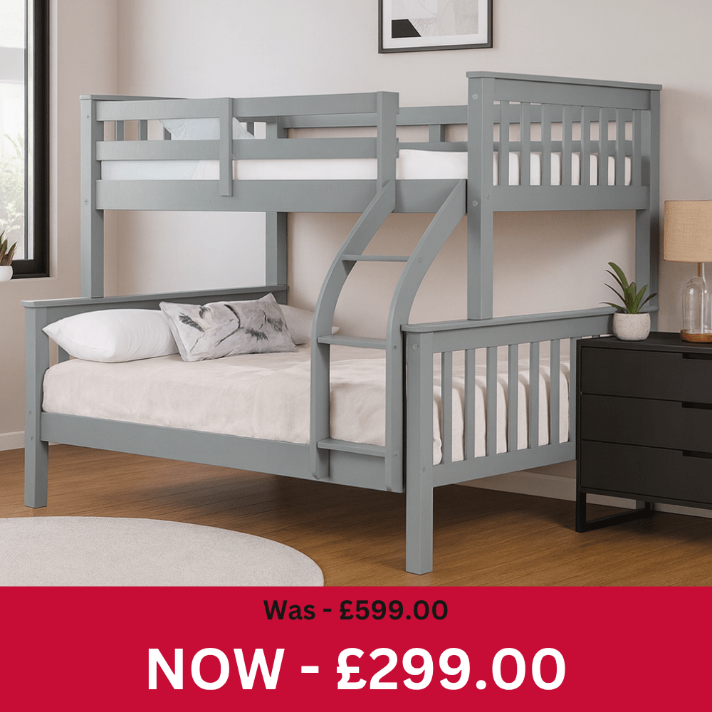 The Treble Bunk Bed is a stylish and practical solution for growing families or sleepovers, offering three comfortable sleeping spaces in one compact design. Crafted from durable painted pine and available in a choice of crisp white or modern grey, this triple sleeper combines strength with contemporary style to suit any bedroom décor. The lower bunk accommodates a spacious small double mattress (120x190cm), while the two upper bunks fit standard single mattresses, making it ideal for both children and guests.