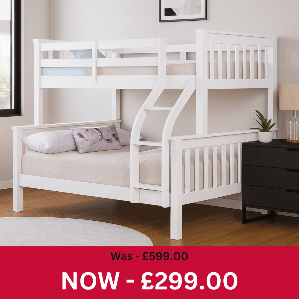 Designed with safety and comfort in mind, the Treble Bunk Bed features a fixed, angled ladder for easy access to the top bunks, along with sturdy plywood slats for reliable mattress support. The top bunk is recommended for mattresses up to 14cm in depth, ensuring a safe night’s sleep. Combining practicality with modern appeal, this bunk bed maximises floor space while creating a smart and inviting sleep solution for busy households.