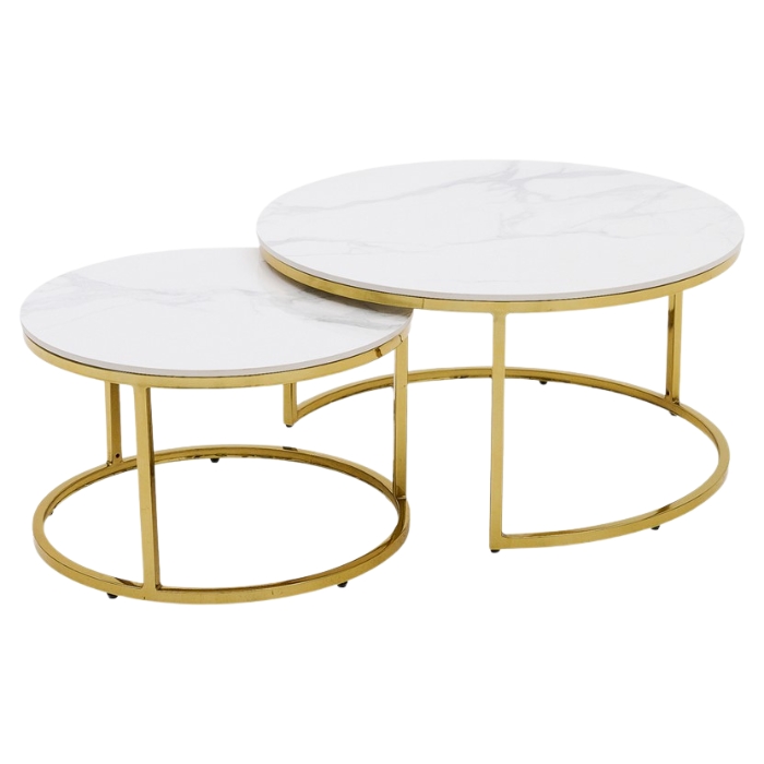 The Circo White Circular Coffee Table Nest offers an elegant and versatile solution for modern living spaces. This set features two tables with a stunning white ceramic top that boasts a beautiful marble effect, adding a sophisticated touch to any room. The tables are designed with a gold-coated metal base that enhances their luxurious appeal, making them a striking addition to your home.