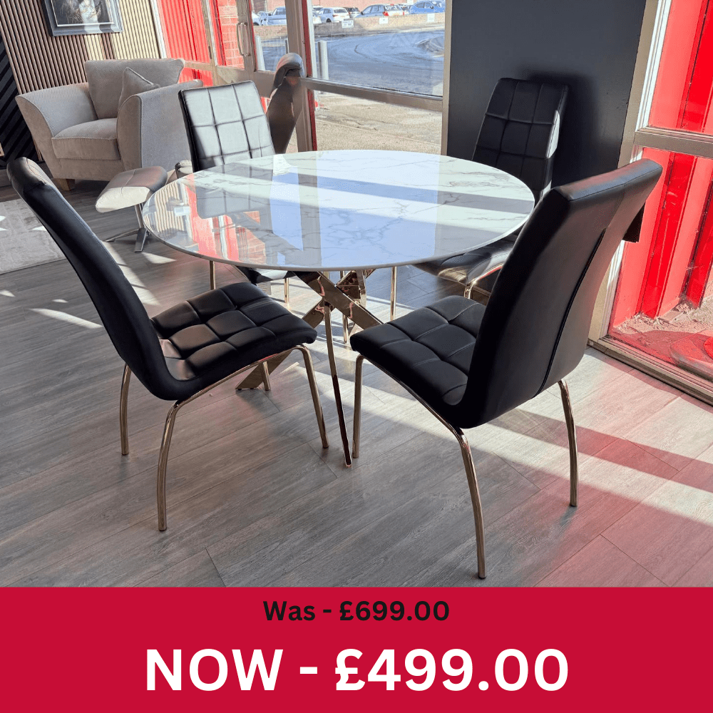 The Aston dining range combines style and sophistication, offering a sleek yet contemporary look for any dining space. The stunning marble-effect tempered glass top is both heat and stain-resistant, ensuring long-lasting beauty and practicality. With a golden frame, each piece is supported by a unique base of four wrapped-around legs, providing exceptional stability and modern flair.