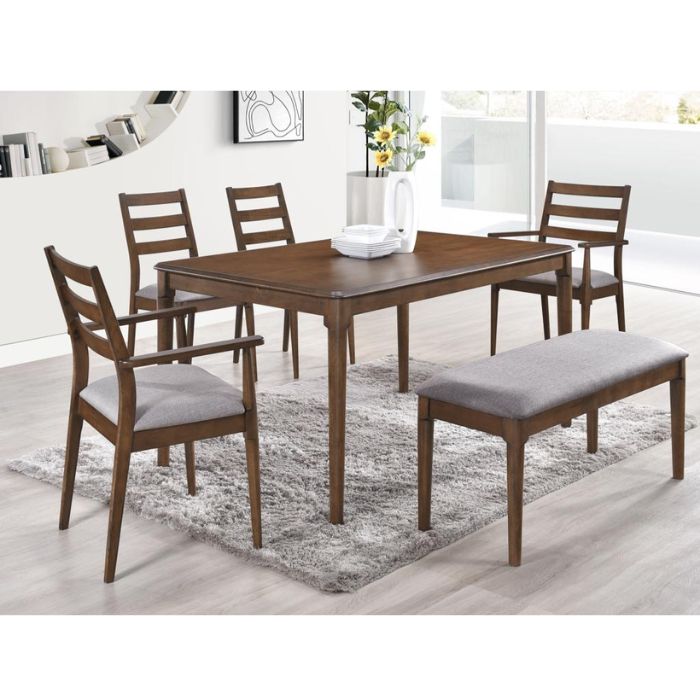 The Oklahoma Oak Table + 2 Chairs + 2 Carver Chairs + Dining Bench brings natural warmth and contemporary style to your dining space. This walnut finish showcases a beautiful, timeless wood grain that instantly elevates the room, while the coordinating bench offers a relaxed and sociable seating option for everyday dining.