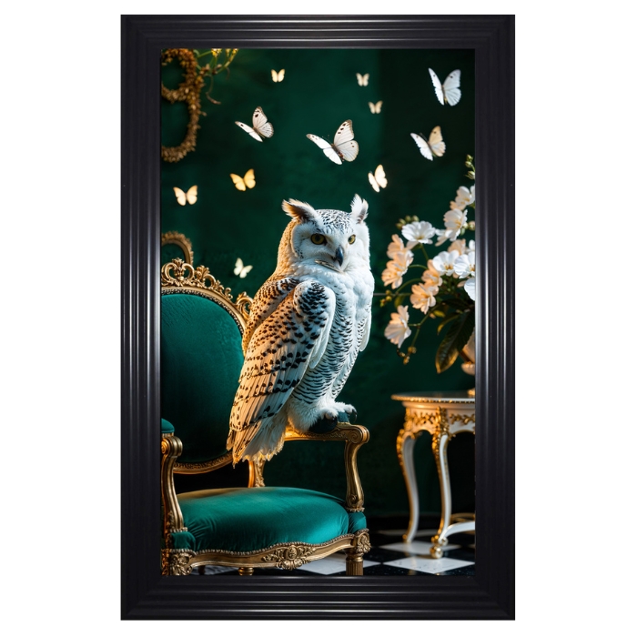 Introduce elegance and character to your home with the Eira Regal Owl Art Print, presented in a bold black frame for a striking finish. Printed onto premium French velvet, this piece offers a soft-touch texture that enhances detail and depth, bringing the owl’s regal presence to life. The rich tones and intricate design make it a captivating focal point, perfect for both contemporary and classic interiors.