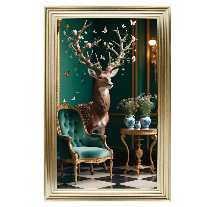 Add a touch of luxury to your home with the Majestic Stag with Floral Antlers Art Print, beautifully presented in a gold frame for a complete, ready-to-hang piece. Printed onto premium French velvet, the artwork features a unique soft-touch texture that brings depth, vibrancy, and an opulent finish, making it stand out from standard prints. The striking stag design, adorned with floral antlers, creates a captivating focal point that complements both contemporary and traditional interiors.
