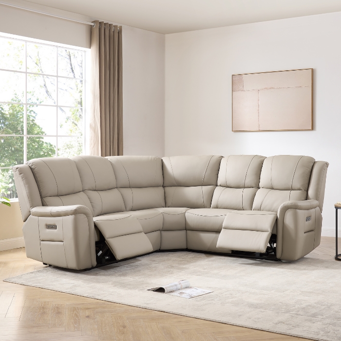 A stylish electric leather recliner offering smooth powered comfort, modern minimalist design, and excellent value for money in a versatile Latte finish.